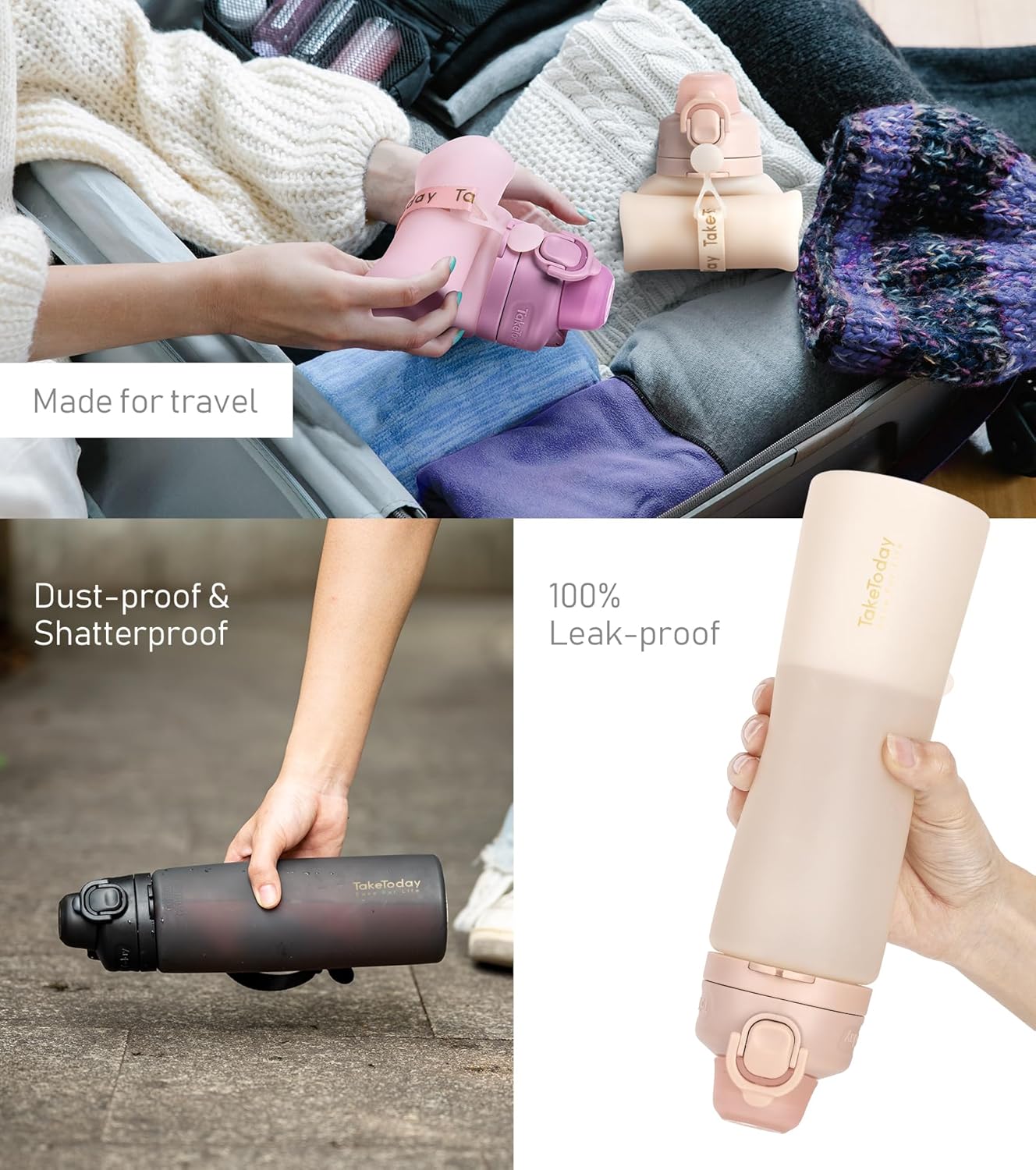 Collapsible Water Bottles 20oz, Leak Proof, BPA-Free, Foldable Silicone Travel Water Bottle with Straw Strap for Cycling, Hiking, Outdoors